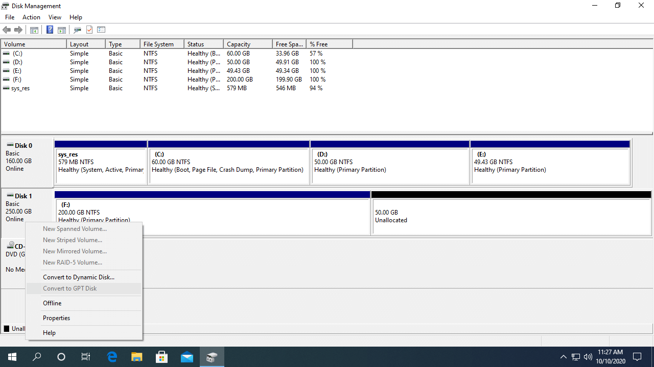 When there's a partition on this disk, you cannot convert disk type in Disk Management, because the convert option is grayed out.