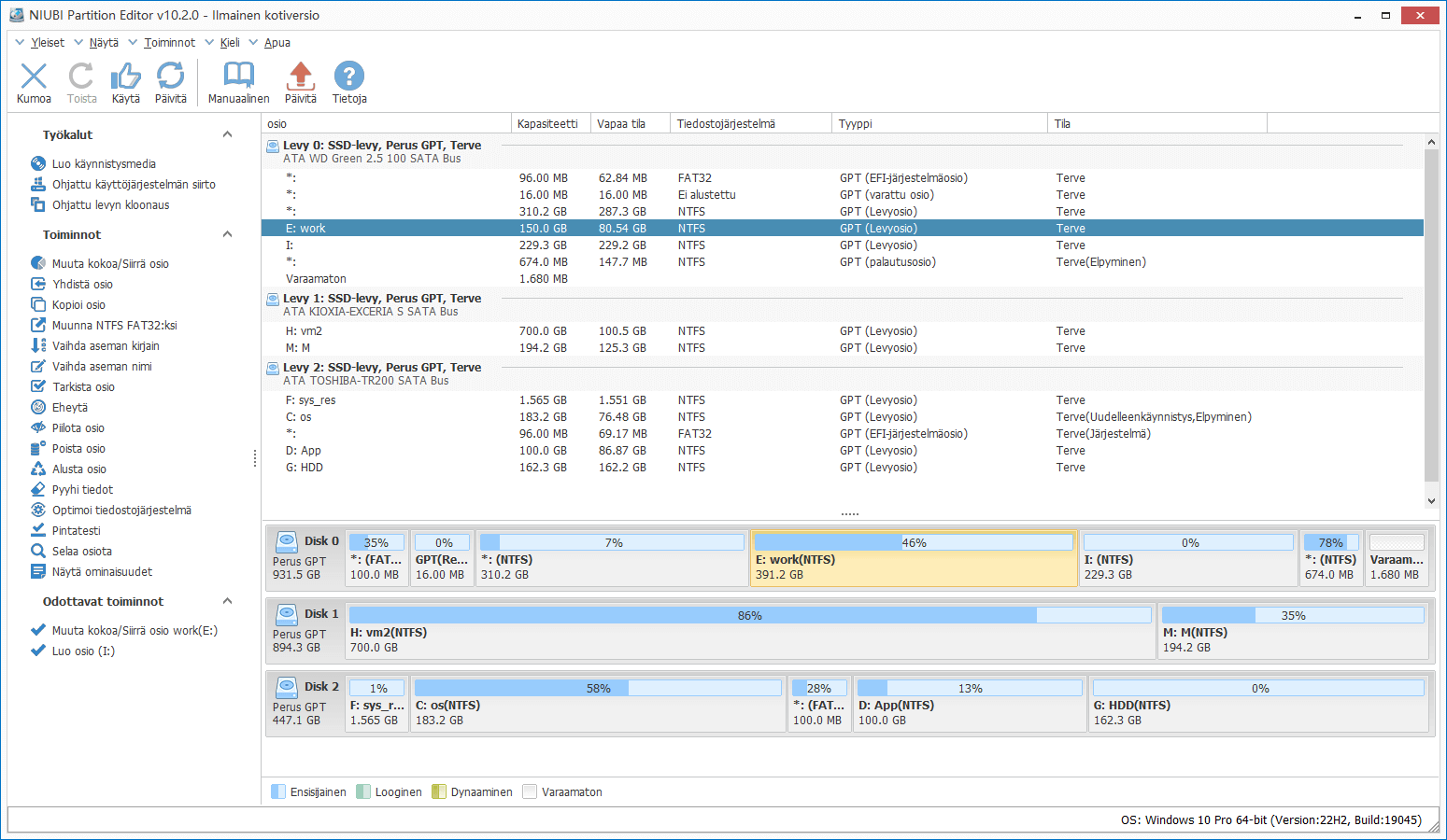 Turvallisimpana ja nopeimpana ilmaisena osio-ohjelmistona Windows 11/10/8/7/Vista/XP-tietokoneille NIUBI Partition Editor Ilmainen versio auttaa pienentämään, laajentamaan, siirtämään, yhdistämään osioita levytilan optimoimiseksi. Muunna levyosion tyyppi. Kloonaa levyosio käyttöjärjestelmän ja datan siirtämiseksi. Optimoi tiedostojärjestelmä ja eheytä osio parantaaksesi tietokoneen suorituskykyä. Luo, poista, alusta, piilota, aktivoi, pyyhi osio, skannaa vialliset sektorit ja paljon muuta.
