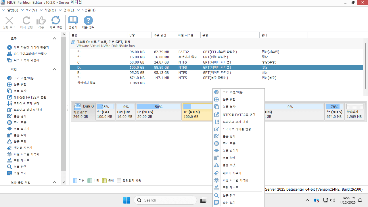 이 서버 파티션 관리자는 Windows Server 2025, 2022, 2019, 2016, 2012, 2008 및 2003을 지원합니다. 모든 인터페이스의 HDD/SSD, 모든 유형의 RAID 배열, VMware/Hyper-V 가상 머신, USB 플래시 드라이브 및 메모리 카드가 모두 지원됩니다.