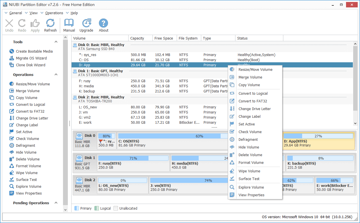 3. Available operations to the selected disk or partition, unavailable operations are hidden automatically.