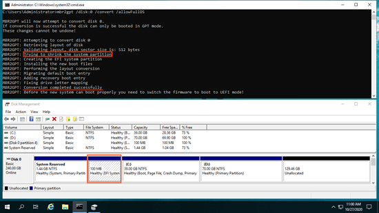 O MBR2GPT tentará primeiro reduzir a partição Reservada do Sistema, se não houver espaço livre suficiente, ele reduzirá a partição de inicialização (unidade C) em vez disso, e então a partição EFI será criada atrás da unidade C. O problema é que o Gerenciamento de Disco do Windows não pode redimensionar, mover ou fazer qualquer outra operação na partição EFI.