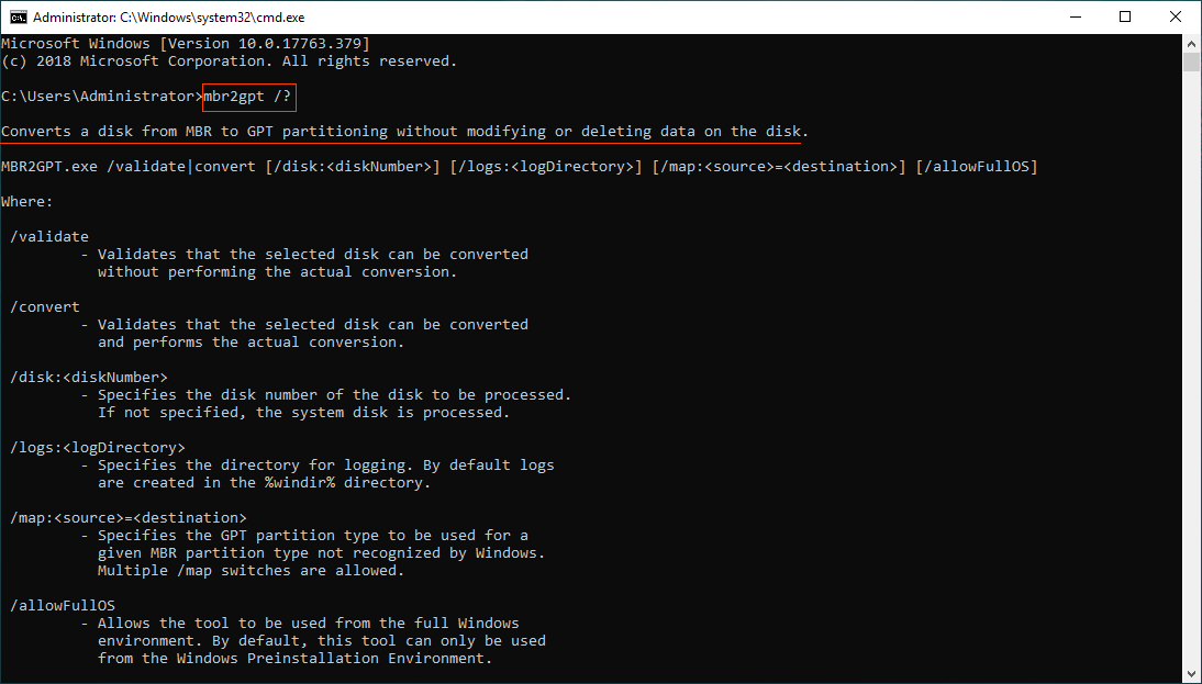 Se você quiser ler mais sobre o MBR2GPT, digite mbr2gpt /? na janela de comando ou visite a página oficial.