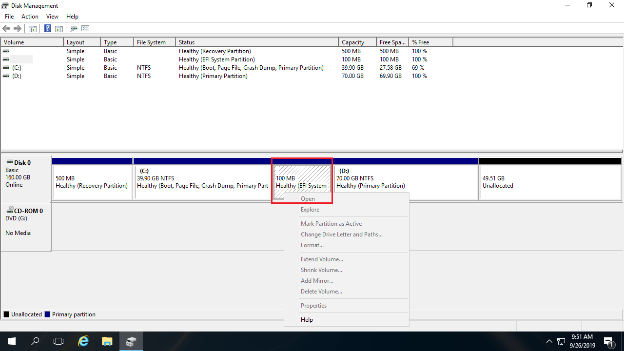 Como você pode ver na captura de tela, uma partição de sistema EFI de 100 MB é criada atrás da unidade C após a conversão do Disco 0 para GPT. Ao clicar com o botão direito nela, todas as opções estão esmaecidas. Isso significa que o Gerenciamento de Disco não pode fazer nada na partição EFI.