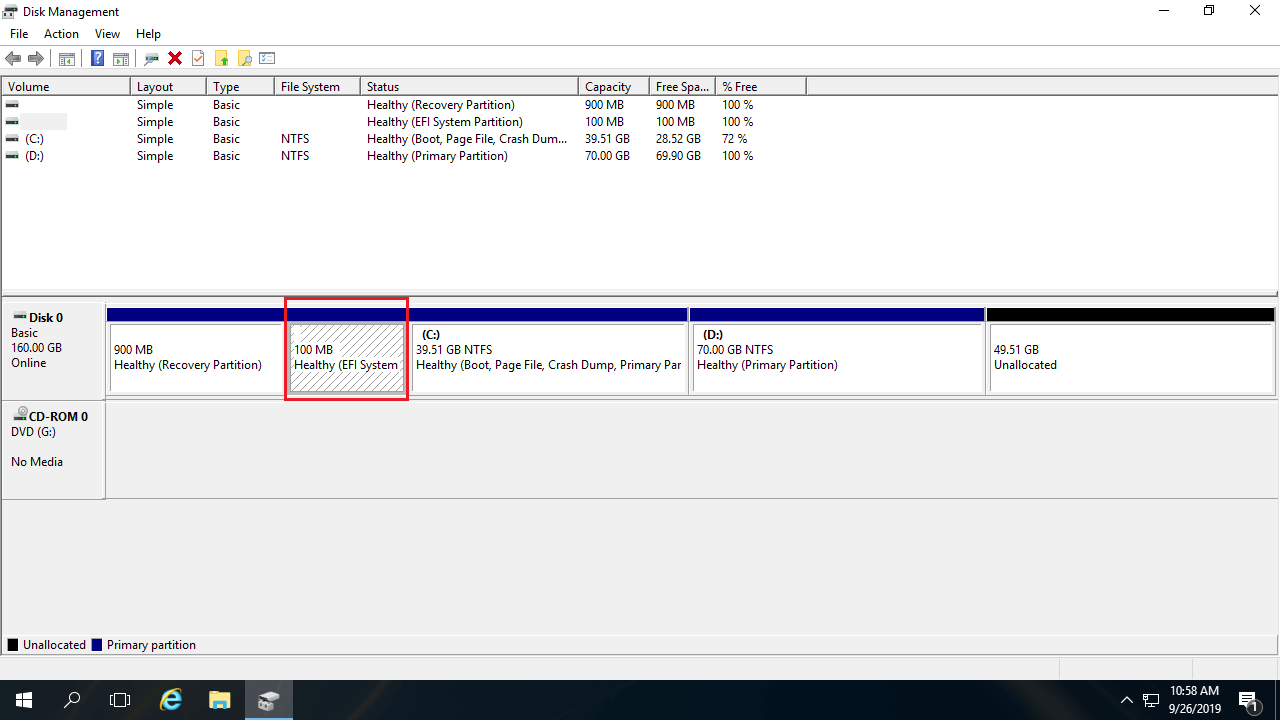 Diferente da partição Reservada do Sistema no disco MBR, uma partição de sistema EFI (ESP) será criada no disco GPT. O MBR2GPT primeiro reduzirá a partição Reservada do Sistema. Se não houver espaço livre suficiente nela, o MBR2GPT reduzirá a unidade C em vez disso. Nesse caso, a partição EFI será criada à direita da unidade C.