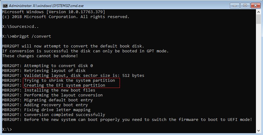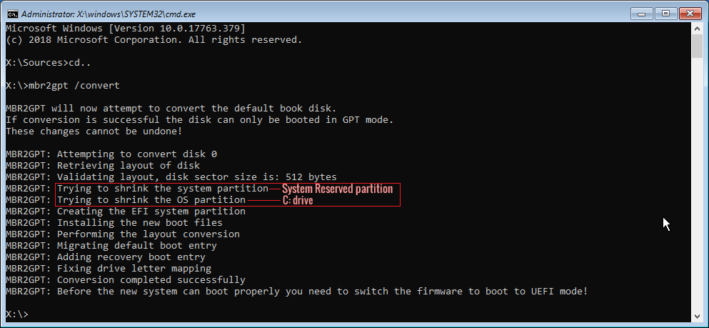 Passo 3: Execute o comando MBR2GPT para converter MBR para GPT no Windows 2016 Server: