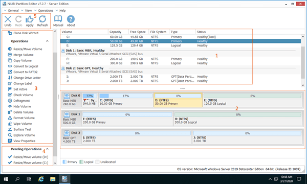 Baixar este software de partição no servidor Windows 2019 (máquina física ou virtual), você verá a janela principal com 5 seções.