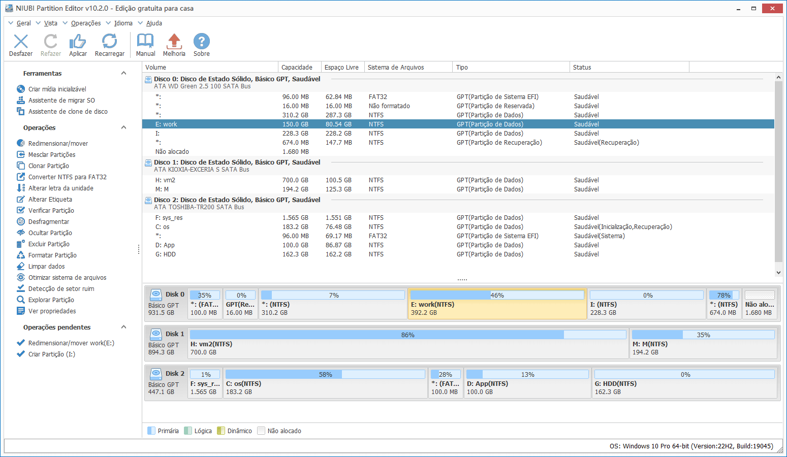 As operações que você realiza serão listadas como pendentes; a partição real do disco não será modificada até clicar em Aplicar para confirmar.