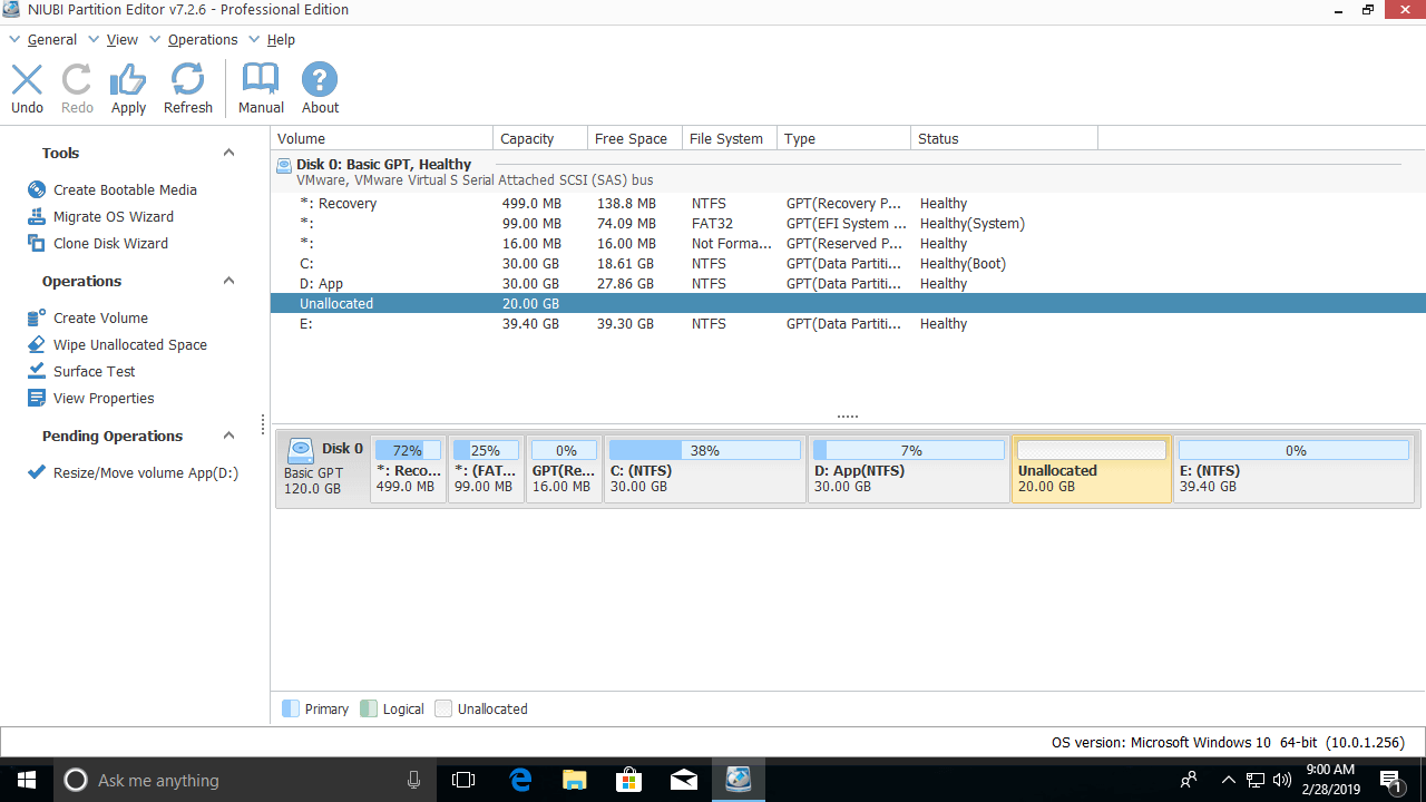 O NIUBI Partition Editor possui uma edição gratuita для para usuários domésticos de computadores com Windows 10/8/7/Vista/XP. É o mesmo que a edição comercial, exceto pela falta da tecnologia de Reversão em 1 Segundo e do construtor de mídia inicializável. Para reduzir a partição no Windows 10 em laptop/desktop/tablet, você só precisa arrastar e soltar no mapa do disco.