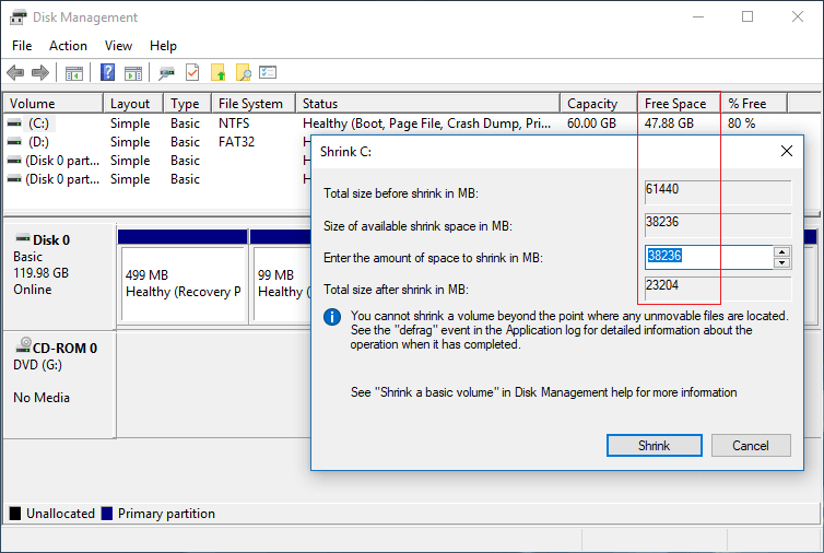 Se houver alguns arquivos imovíveis, como o arquivo de paginação e arquivos de hibernação localizados nesta partição, o Gerenciador de Disco só poderá reduzir um pequeno espaço.