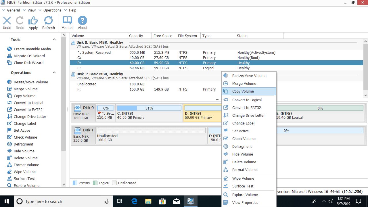 Passo 2: Clique com o botão direito na partição que você quer mover (aqui é D:) e selecione "Copiar Volume".