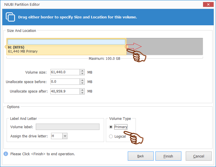 Quando há espaço não alocado contíguo, é muito fácil mover a partição no computador com Windows 10/8/7, basta arrastar e soltar no mapa do disco e apenas 1 passo é necessário. Se você usa arranjos de hardware RAID como RAID 0/1/5/10, não desfaça o arranjo RAID, siga o mesmo passo abaixo.