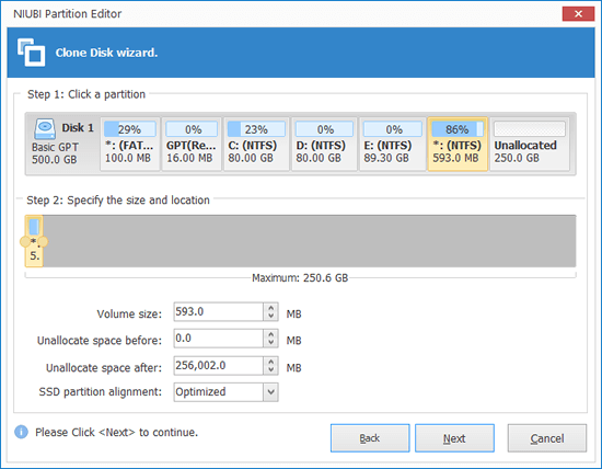- Selecione o espaço não alocado no disco de destino e clique em Próximo.