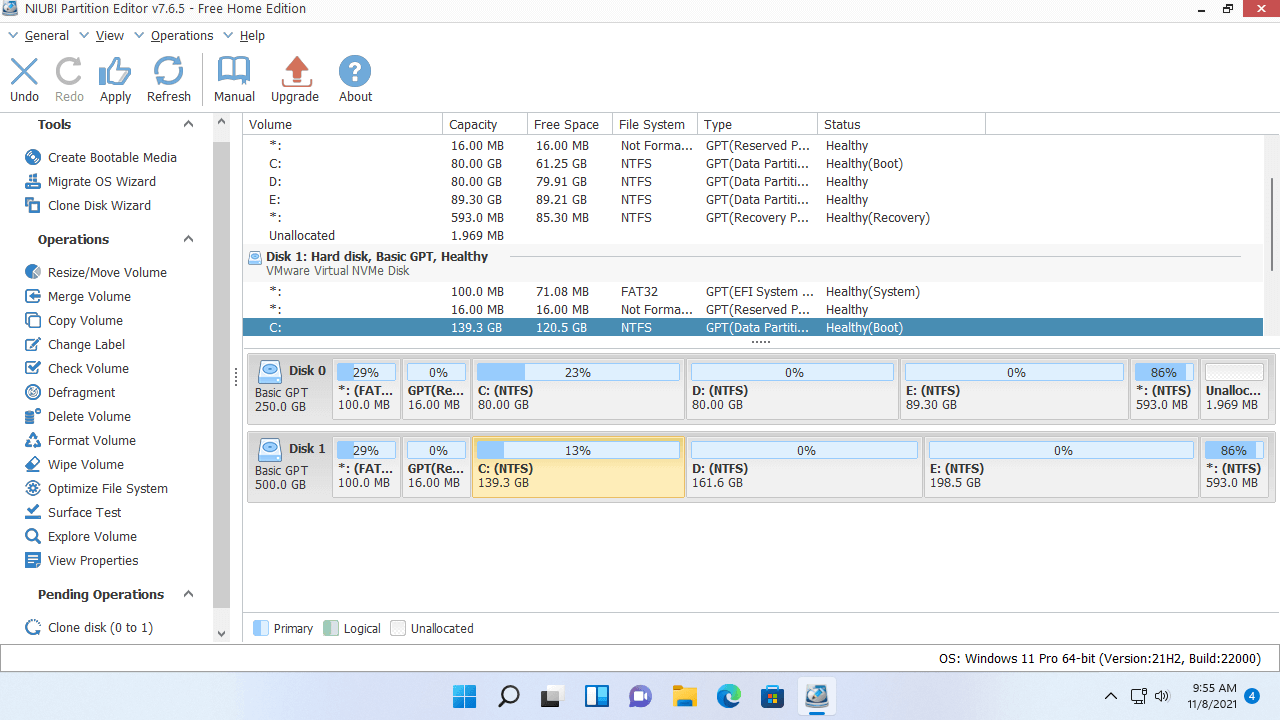 - Baixar a edição gratuita do NIUBI, você verá todos os dispositivos de armazenamento com o layout da partição и outras informações na janela principal.