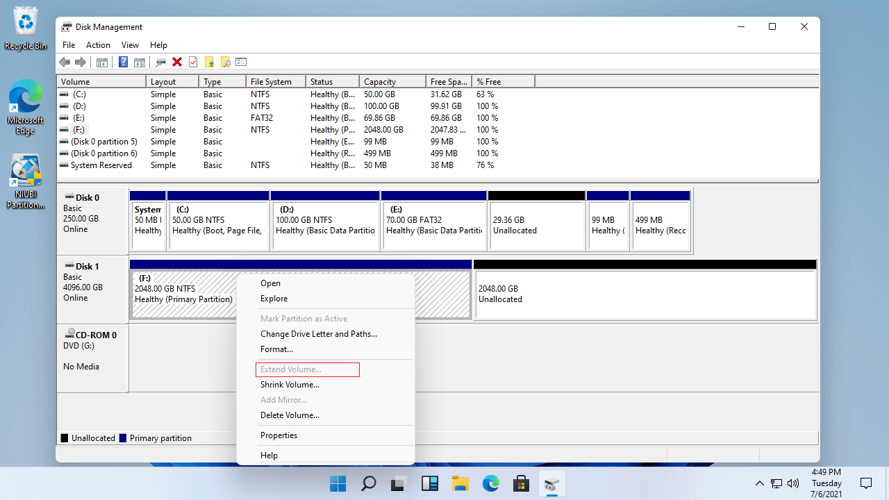 Não importa se a opção para estender a unidade C está desabilitada no Windows 11 ou se a opção Estender Volume está desativada para uma partição de dados, quando você não consegue estender a partição com espaço não alocado não adjacente, execute o NIUBI Partition Editor para mover a partição e tornar o espaço não alocado adjacente.
