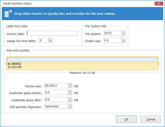 Dicas: se você quiser criar várias partições com espaço não alocado, pode arrastar qualquer borda no meio ou inserir um valor em "Tamanho do volume" na parte inferior.