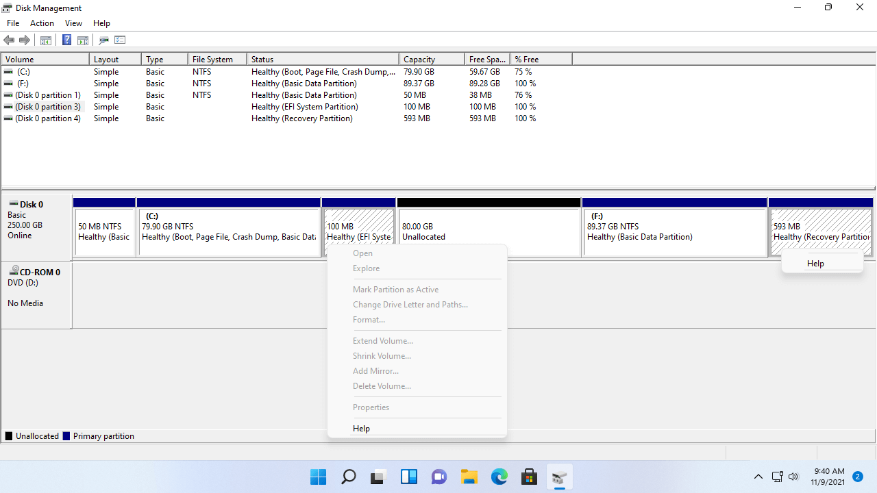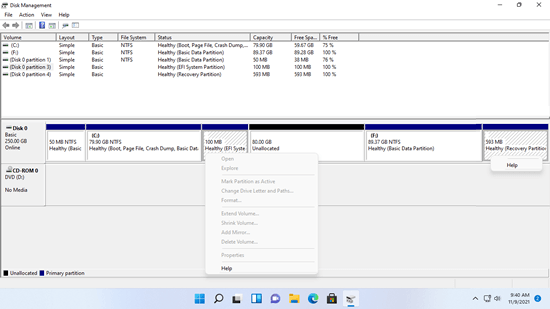 No Gerenciamento de Disco nativo do Windows 11/10, não há sistema de arquivos exibido para a partição EFI. Todas as operações úteis estão desabilitadas. Para a partição de Recuperação, não há letra de unidade ou sistema de arquivos exibido, há apenas a opção Ajuda no Gerenciamento de Disco.