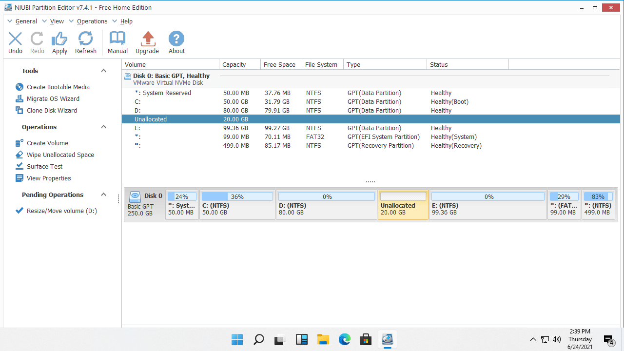 Existem muitos softwares de partição de disco para computadores com Windows no mercado. Mas o NIUBI Partition Editor é recomendado por muitos editores e usuários, porque a edição gratuita é 100% limpa, sem nenhum plugin empacotado. Além disso, ele не desativa funções para a versão paga como outras ferramentas. O mais importante é que ele é muito mais seguro e rápido por causa das tecnologias exclusivas de Reversão em 1 Segundo, Modo Virtual, Cancelar à Vontade e do algoritmo especial de movimentação de arquivos. Para reduzir a partição no computador com Windows 11, você só precisa clicar, arrastar e soltar no mapa do disco.
