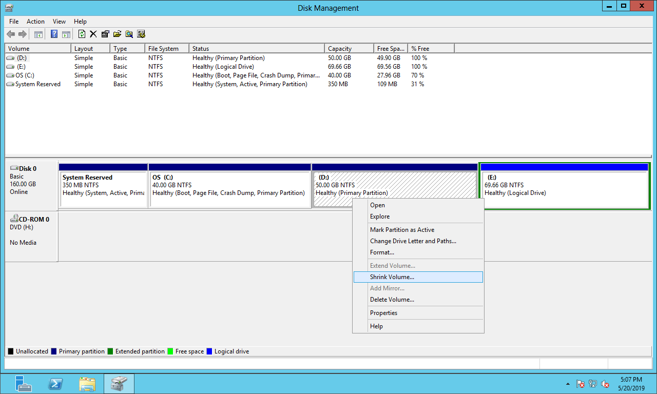 Como diminuir partição com o Gerenciamento de Disco no Server 2012