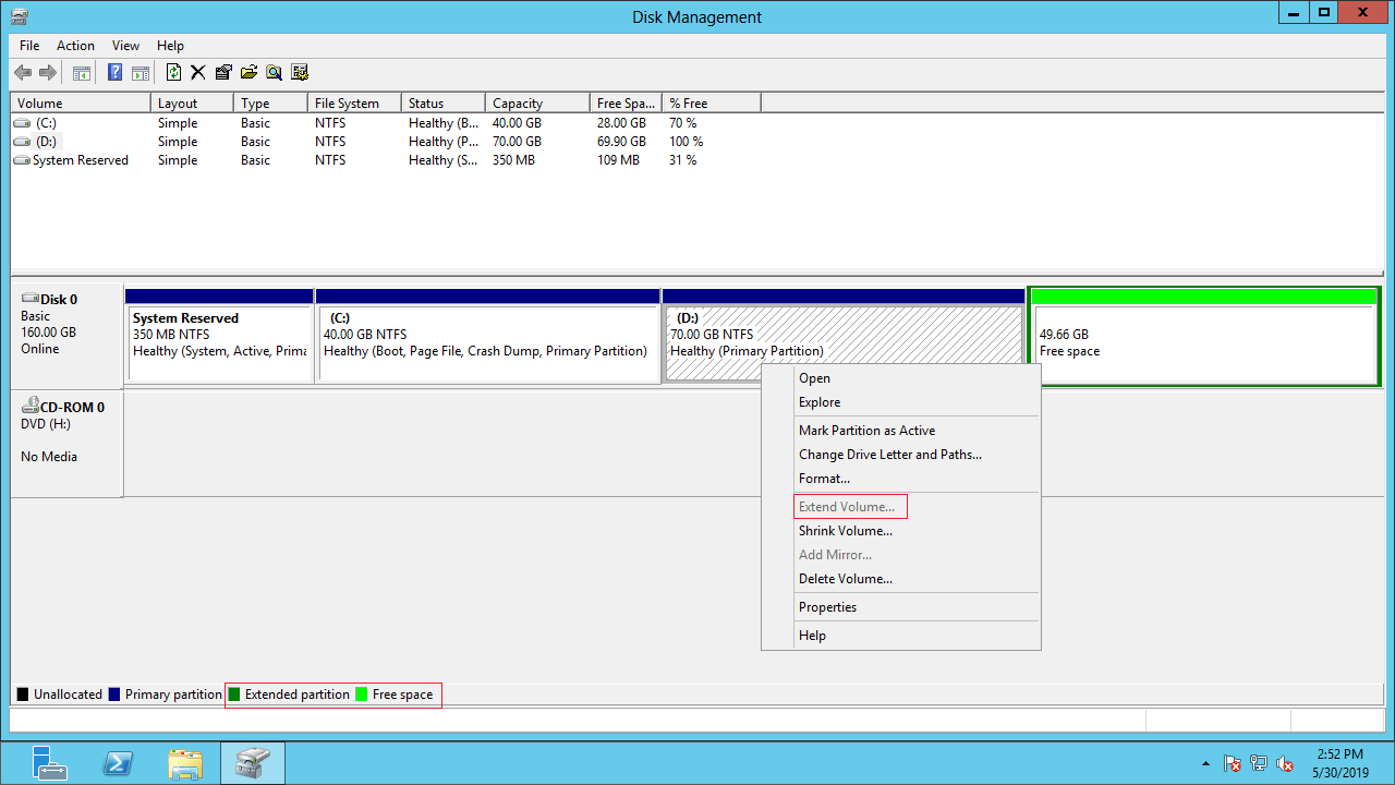 Como resolver Estender Volume acinzentado no Server 2012/2016/2019/2022: