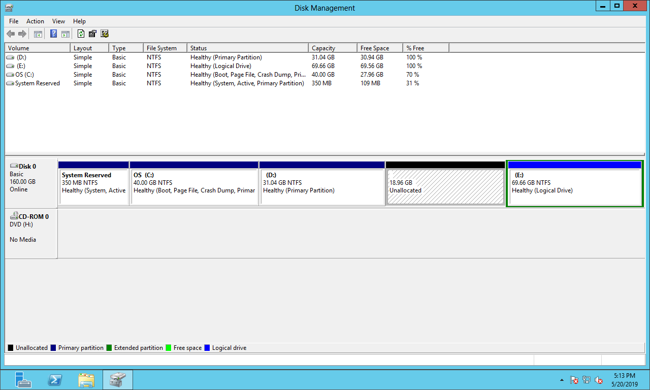 A unidade D no meu servidor de teste está vazia, mas na janela de diminuição, o Gerenciamento de Disco me dá apenas 19417 MB (18,96 GB) de espaço disponível, então eu só posso diminuir a unidade D para 31,04 GB.