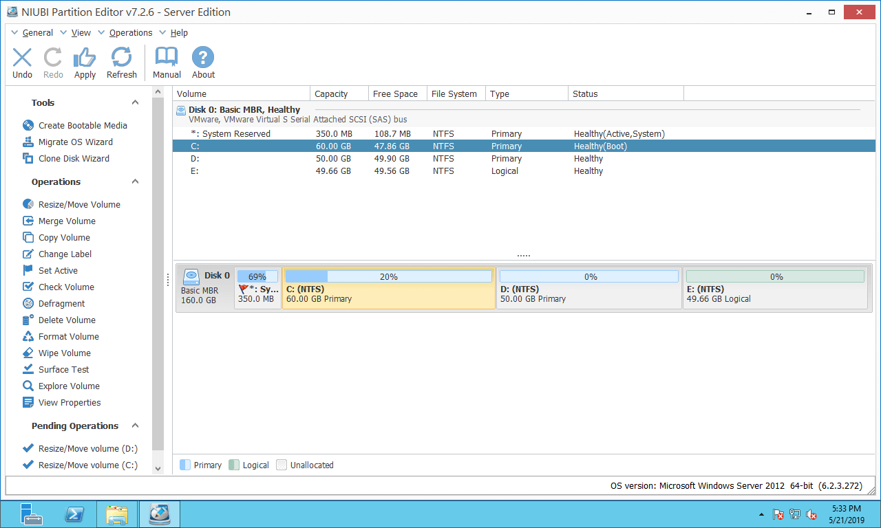 Baixar o NIUBI Partition Editor, você verá todos os discos conectados com estrutura de partição e outras informações à direita, as operações disponíveis para o disco ou partição destacado são listadas à esquerda e clicando com o botão direito. Como você vê no meu servidor, há as unidades C, D e E no Disco 0.