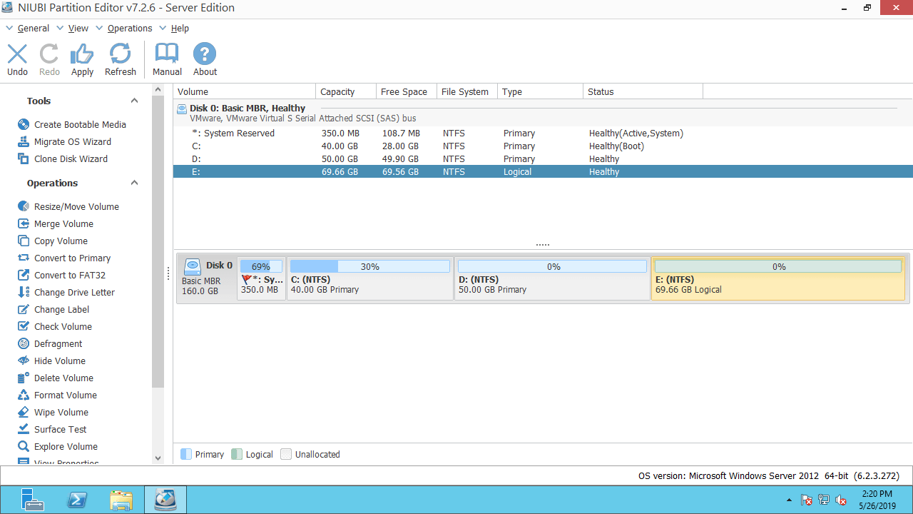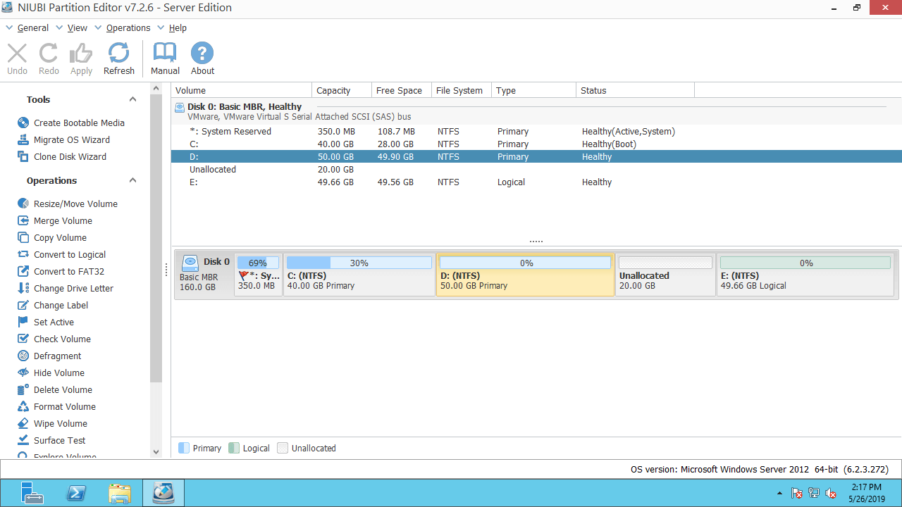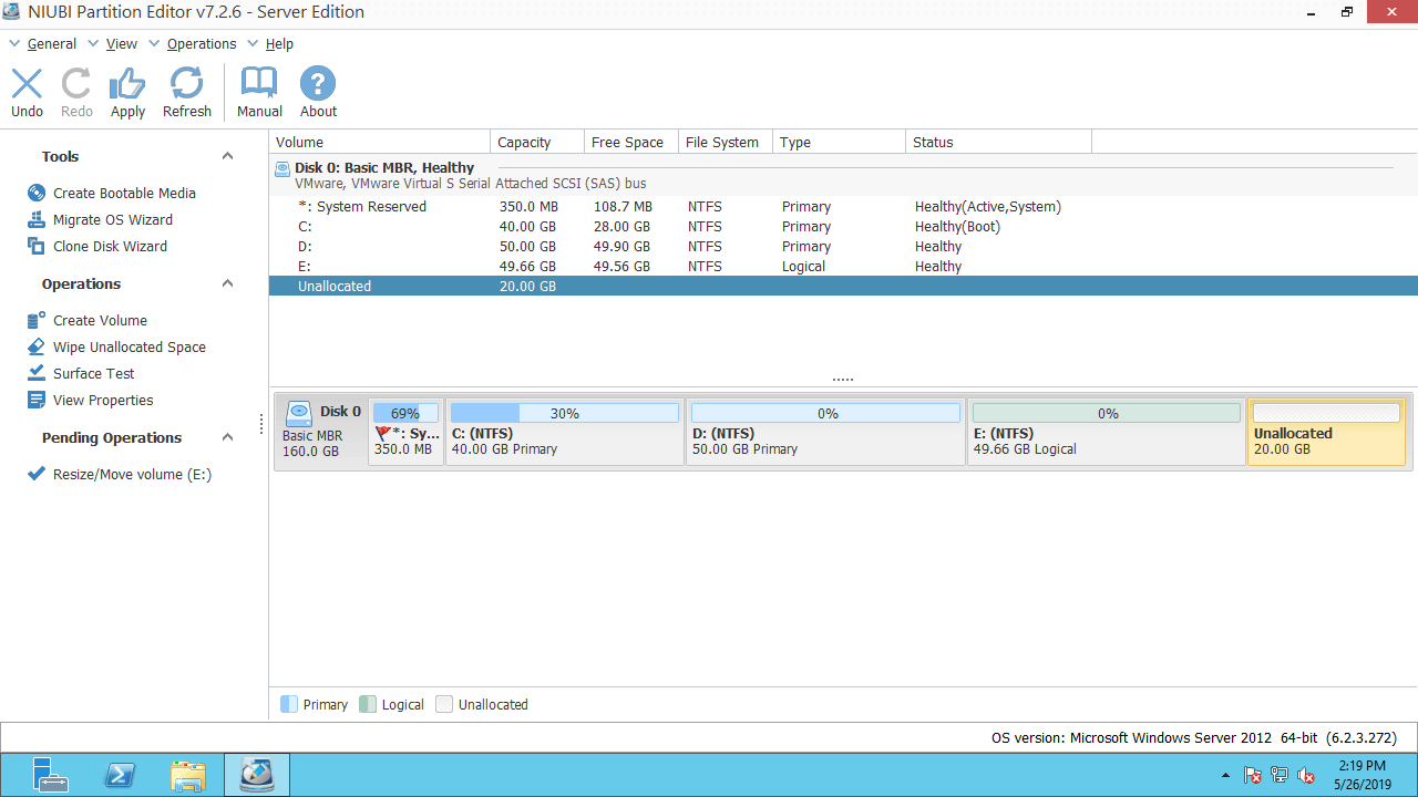 Assista ao vídeo sobre como mover e mesclar espaço não alocado no servidor Windows 2012: