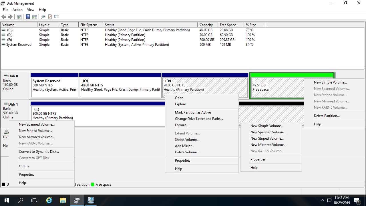 Após abrir o Gerenciamento de Disco no Windows Server 2016, clique com o botão direito em uma partição, na frente do disco ou em qualquer espaço não alocado, você verá as opções associadas, as opções indisponíveis estão esmaecidas.