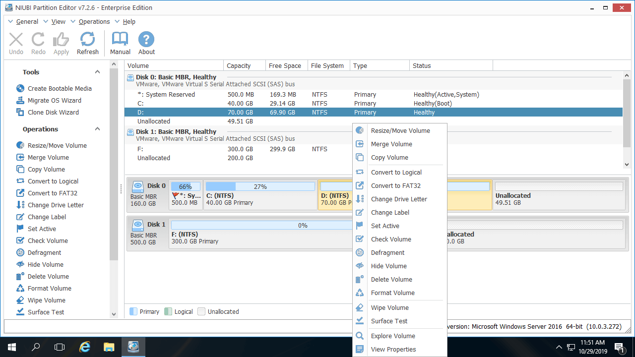 Este gerenciador de partição de servidor permite diminuir, estender, mover e mesclar partições sem perda de dados, otimizando o espaço em disco. Ele também otimiza o sistema de arquivos e desfragmenta partições para melhorar o desempenho do computador. Você pode clonar partições de disco para migrar o sistema operacional e dados, e converter tipos de disco/partição sem perder dados - como converter discos dinâmicos em básicos, NTFS para FAT32, ou alternar entre partições primárias e lógicas. Além disso, ajuda na criação, exclusão, formatação, ocultação, ativação, limpeza de partições, verificação de setores defeituosos e muito mais. Aprenda como gerenciar partições de disco no Windows Server 2016.
