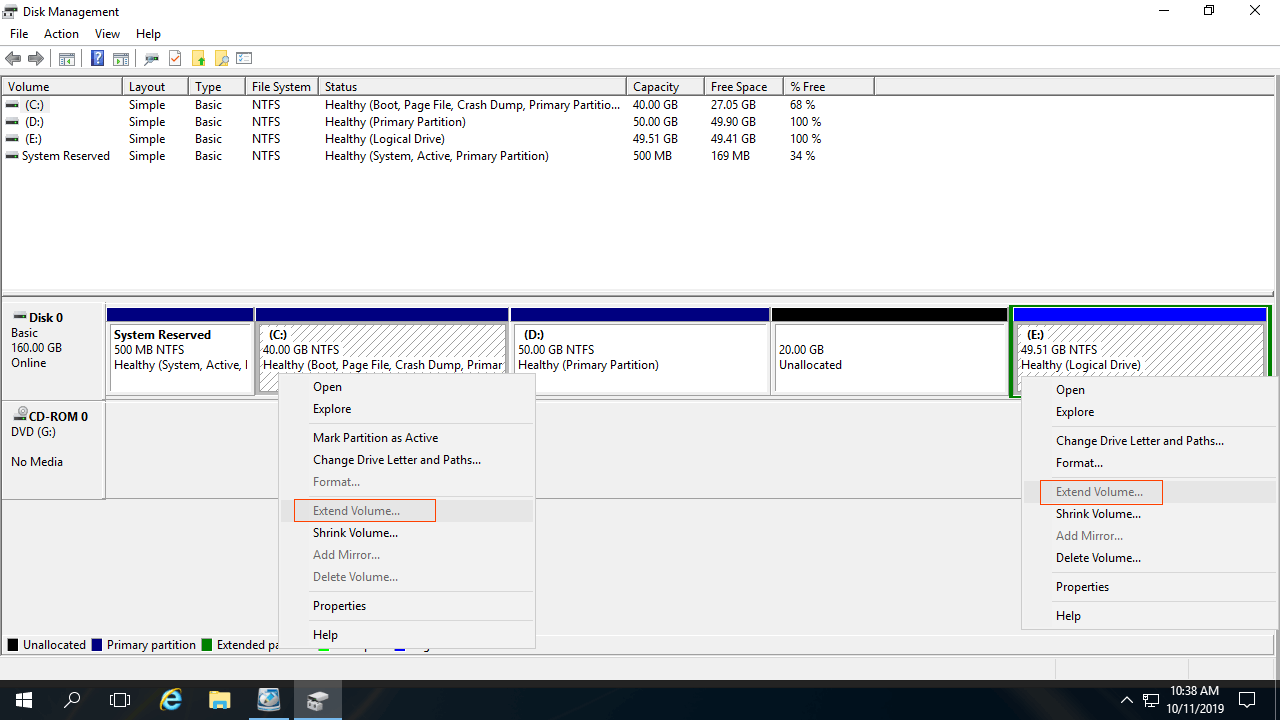 Muitos administradores de servidor diminuíram a unidade D/E antes de estender a unidade C:, mas Estender Volume ainda está desabilitado no Windows Server 2016.