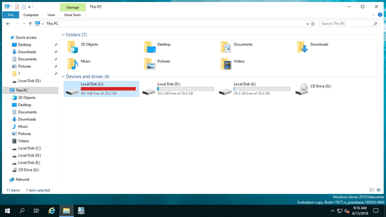 Se a unidade C do sistema está ficando sem espaço no Windows Server 2019/2022, quando você abre o Explorador de Arquivos, a unidade C é exibida em vermelho em vez da barra azul padrão. Isso é projetado para alertar o administrador do servidor a prestar atenção à situação urgente.
