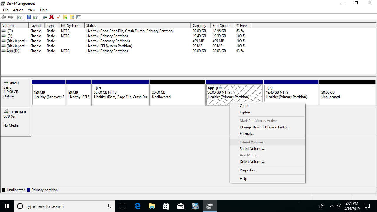Extend D drive with Windows 10 Disk Management