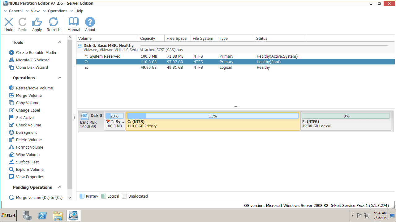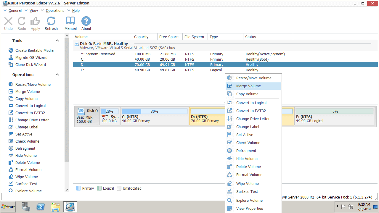 How to merge 2 partitions in Windows Server 2008 R2 with NIUBI Partition Editor: