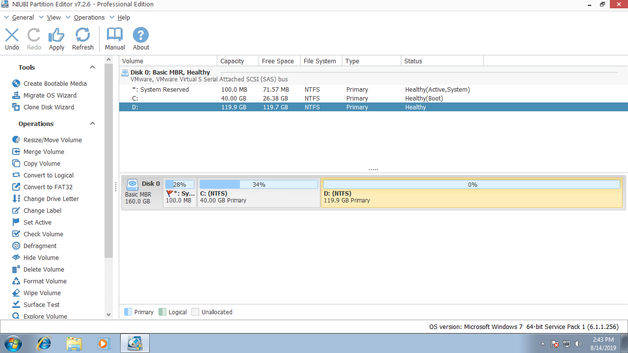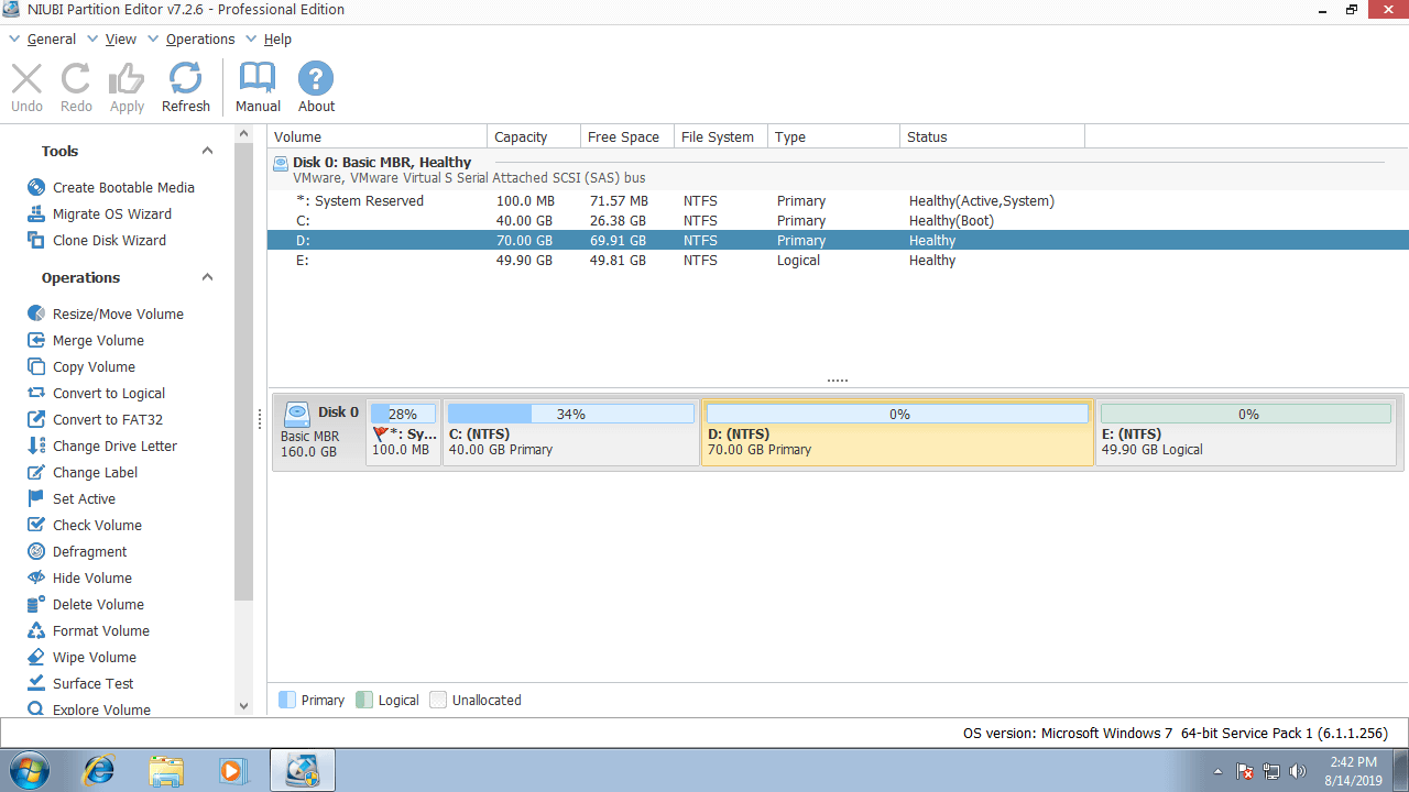 Download NIUBI Partition Editor, you'll see all disk partitions with structure and other information on the right, available operations to selected disk or partition are listed on the left and by right clicking.